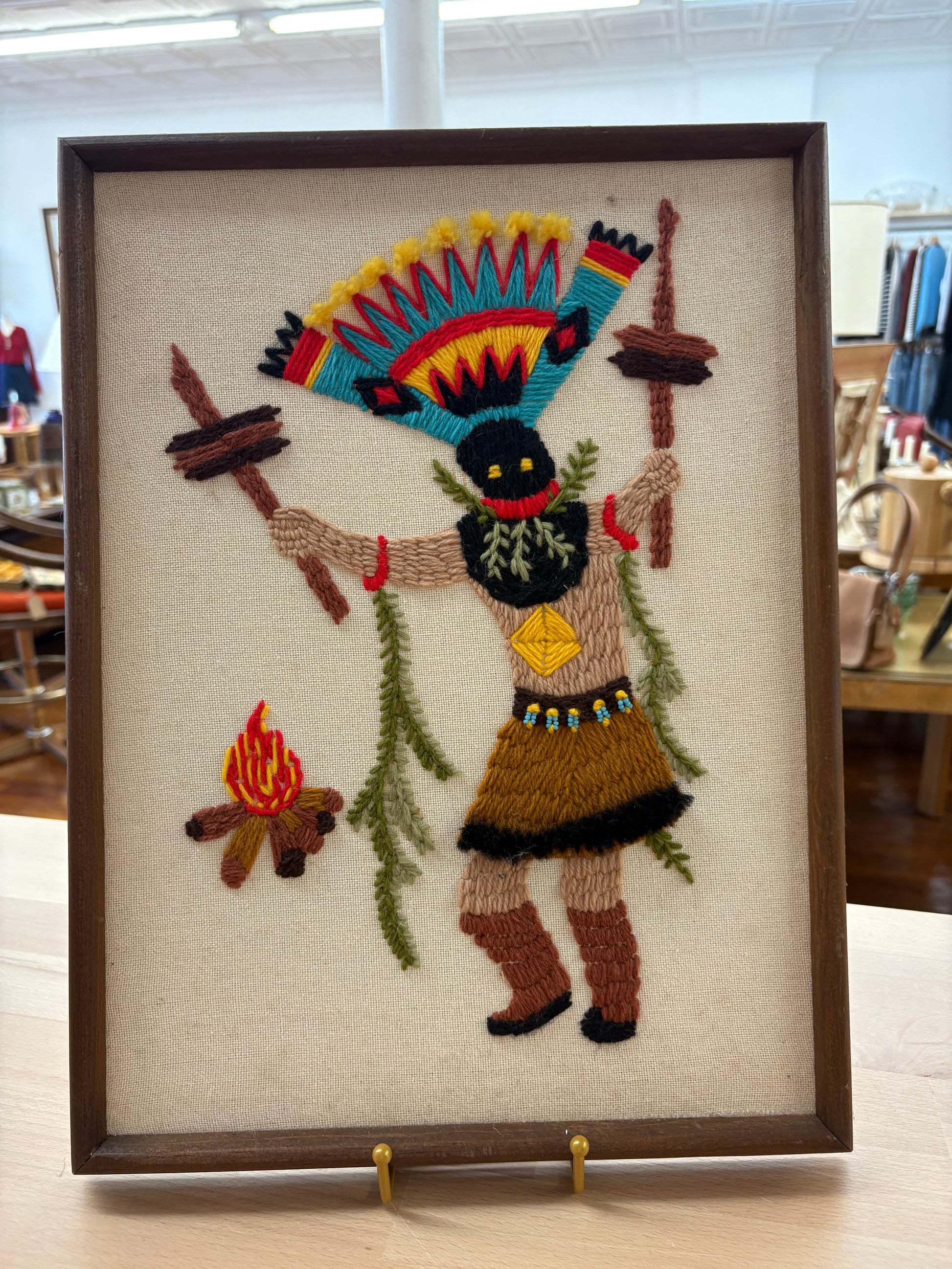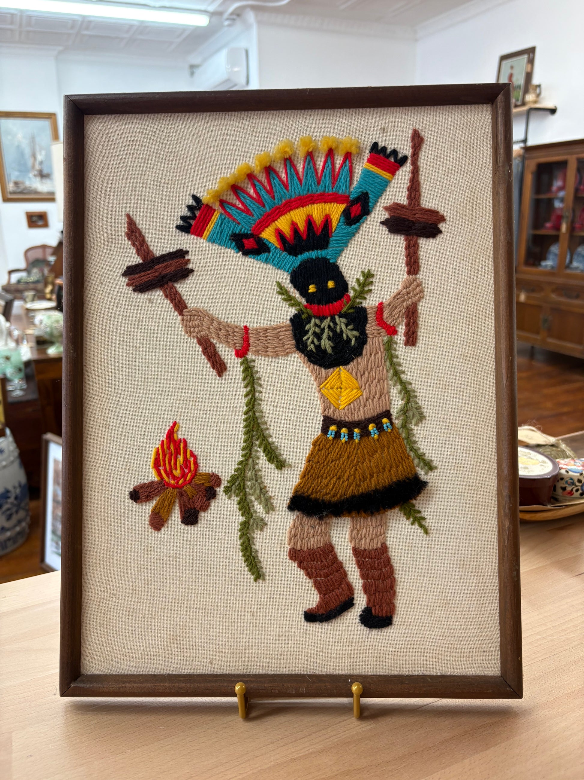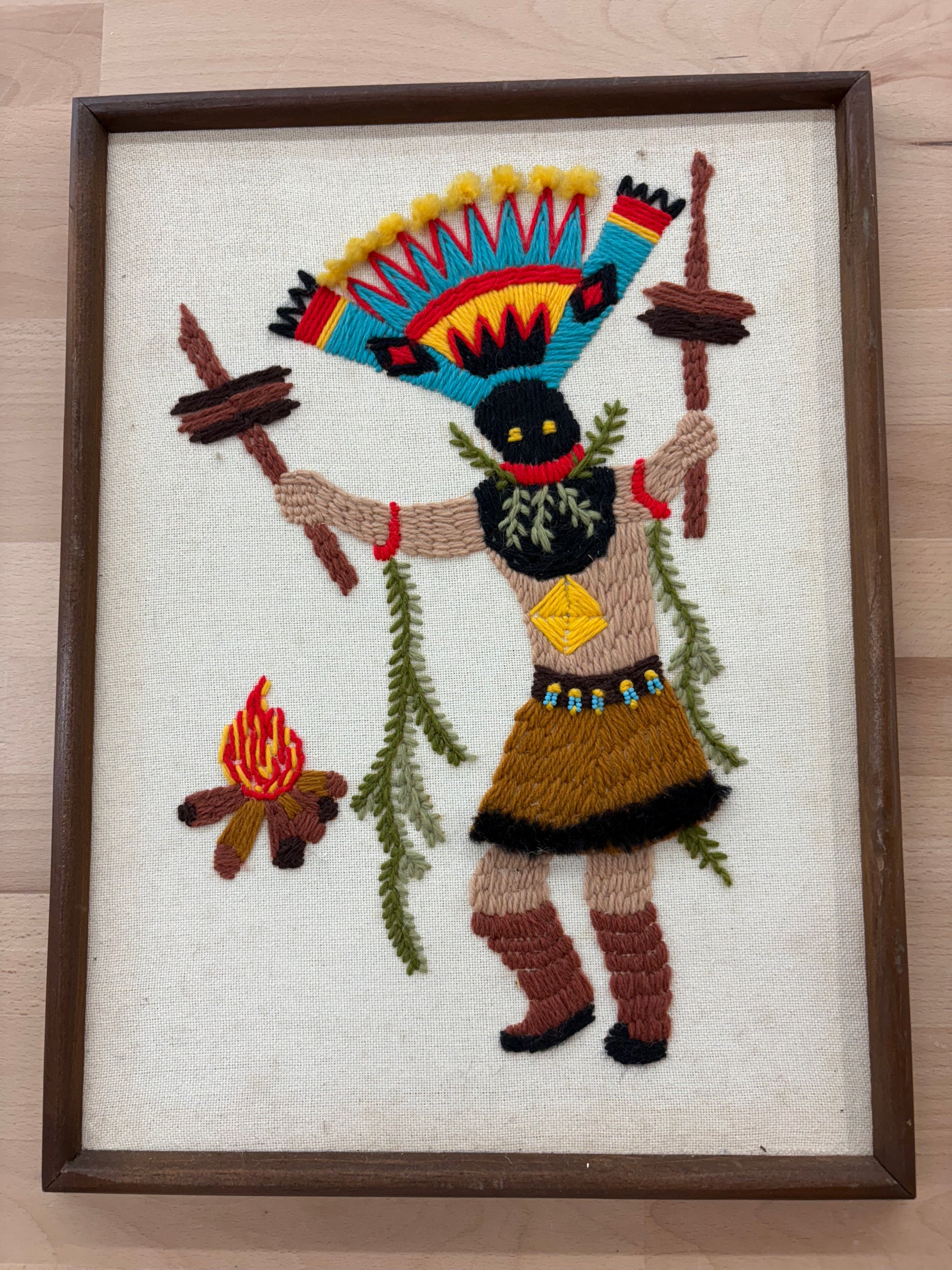 A vintage 1970s Apache Gaan dancer needlepoint, beautifully handcrafted—with rich wool yarn stitched onto canvas and framed under glass. This striking Southwest folk art piece features an Apache dancer in traditional ceremonial regalia, complete with feathered headdress, hoop, and saddle cloth.