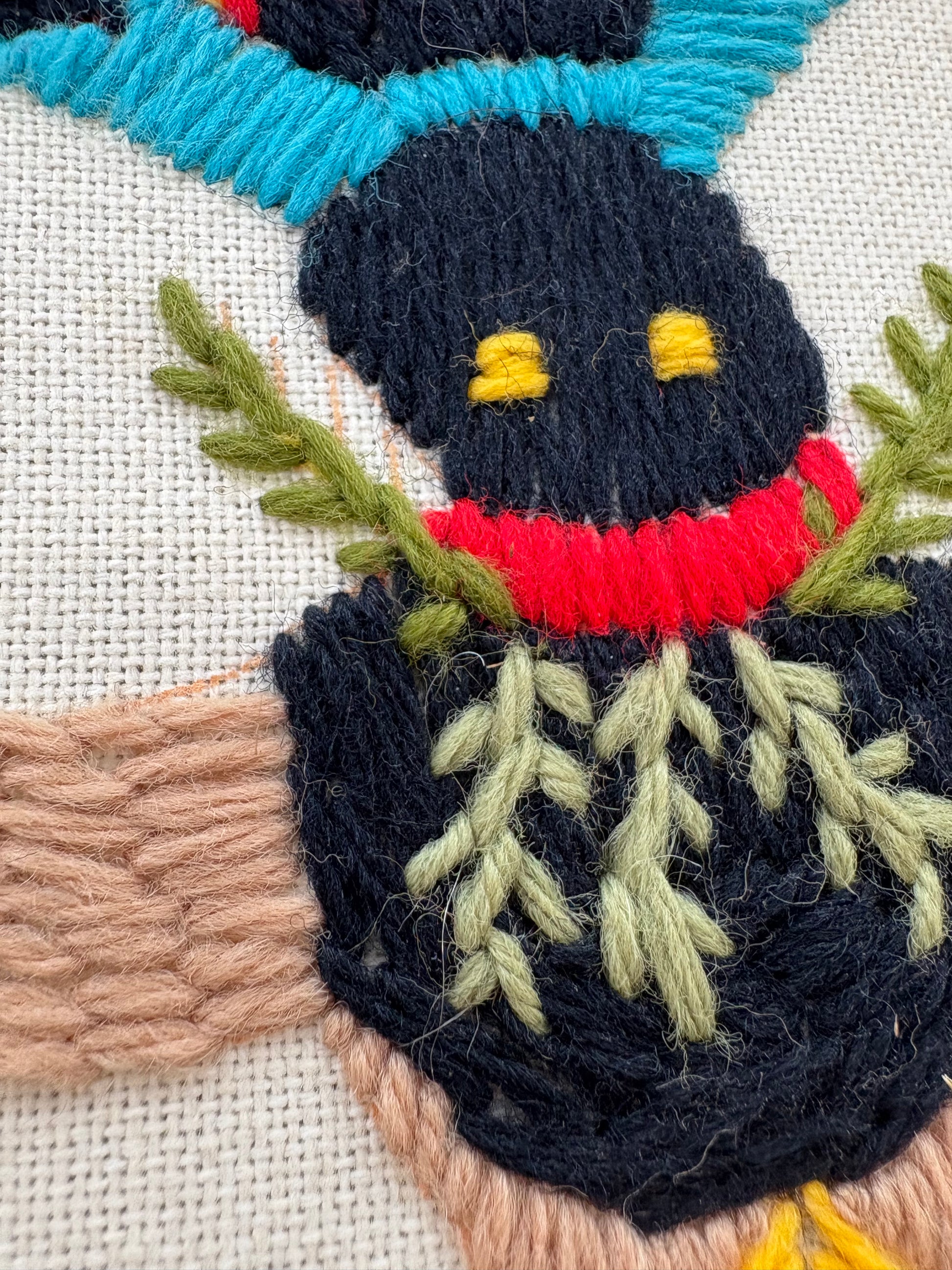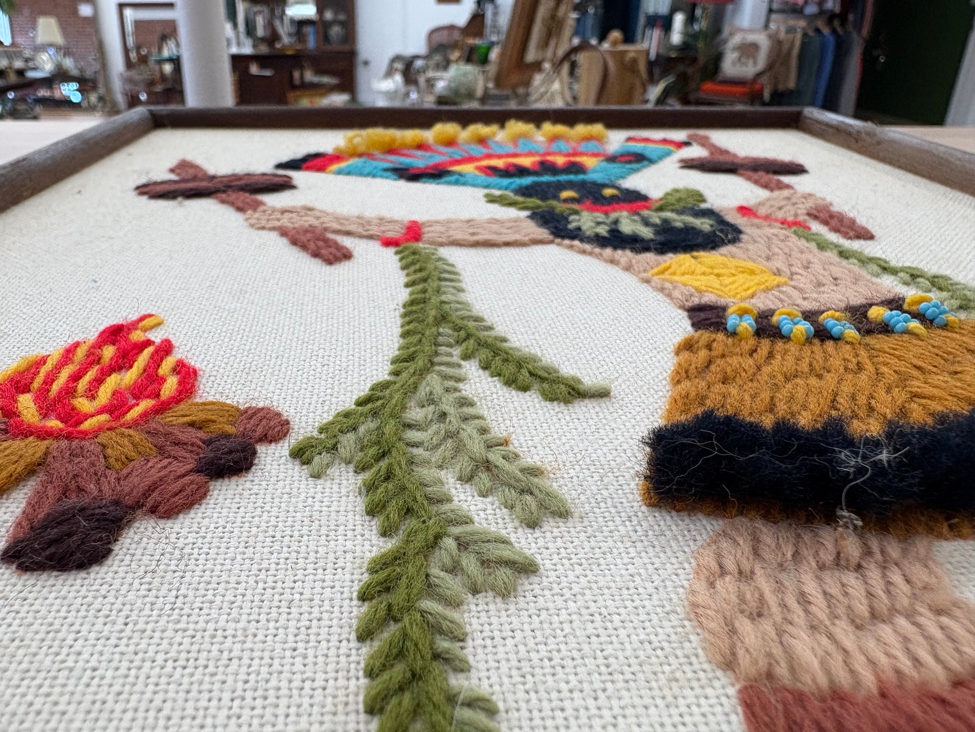 - Materials: Wool yarn needlepoint on stiff canvas, framed behind glass in a wood frame