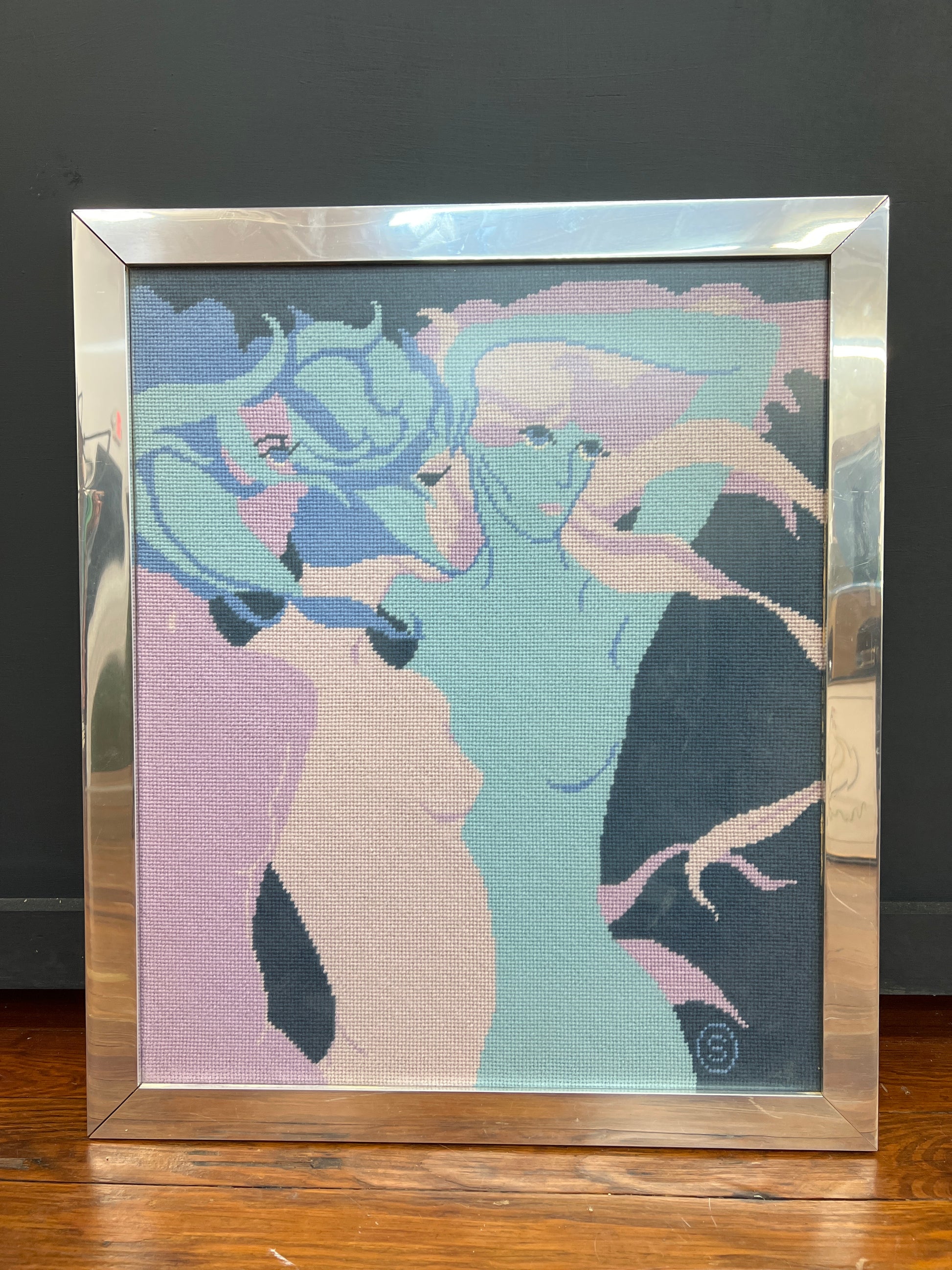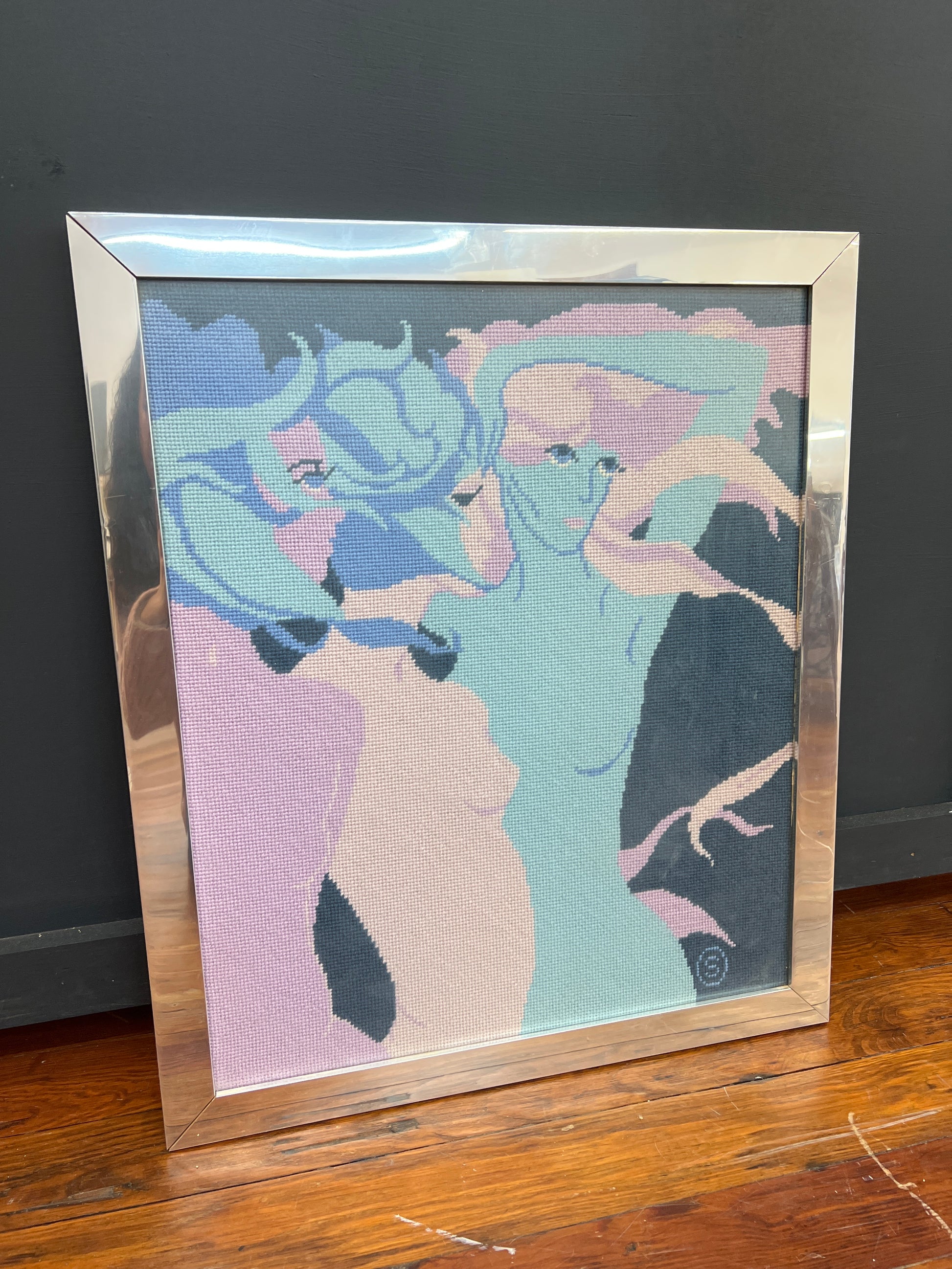 A striking and sensual 1976 hand-stitched needlepoint artwork featuring abstracted female forms in soft, cool-toned pastels. This vintage textile piece captures the fluidity and confidence of mid-century modern design, using crewelwork techniques in muted pinks, blues, and lavenders. Set in a sleek chrome frame, it adds instant visual interest and texture to any space.