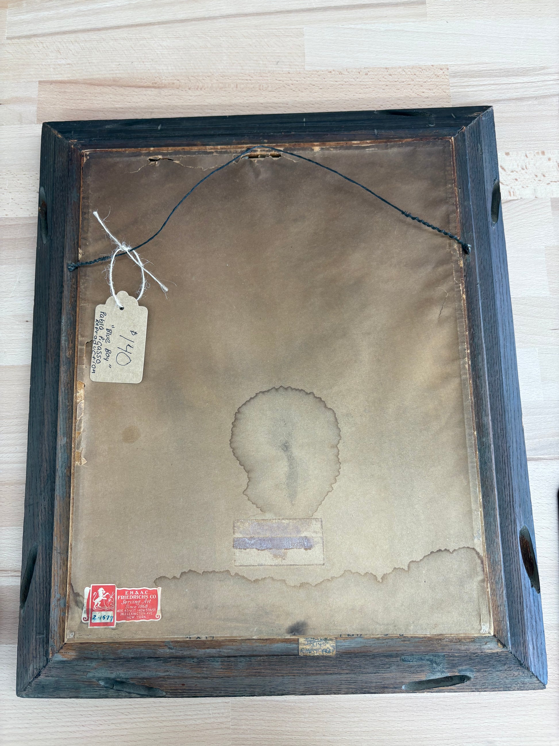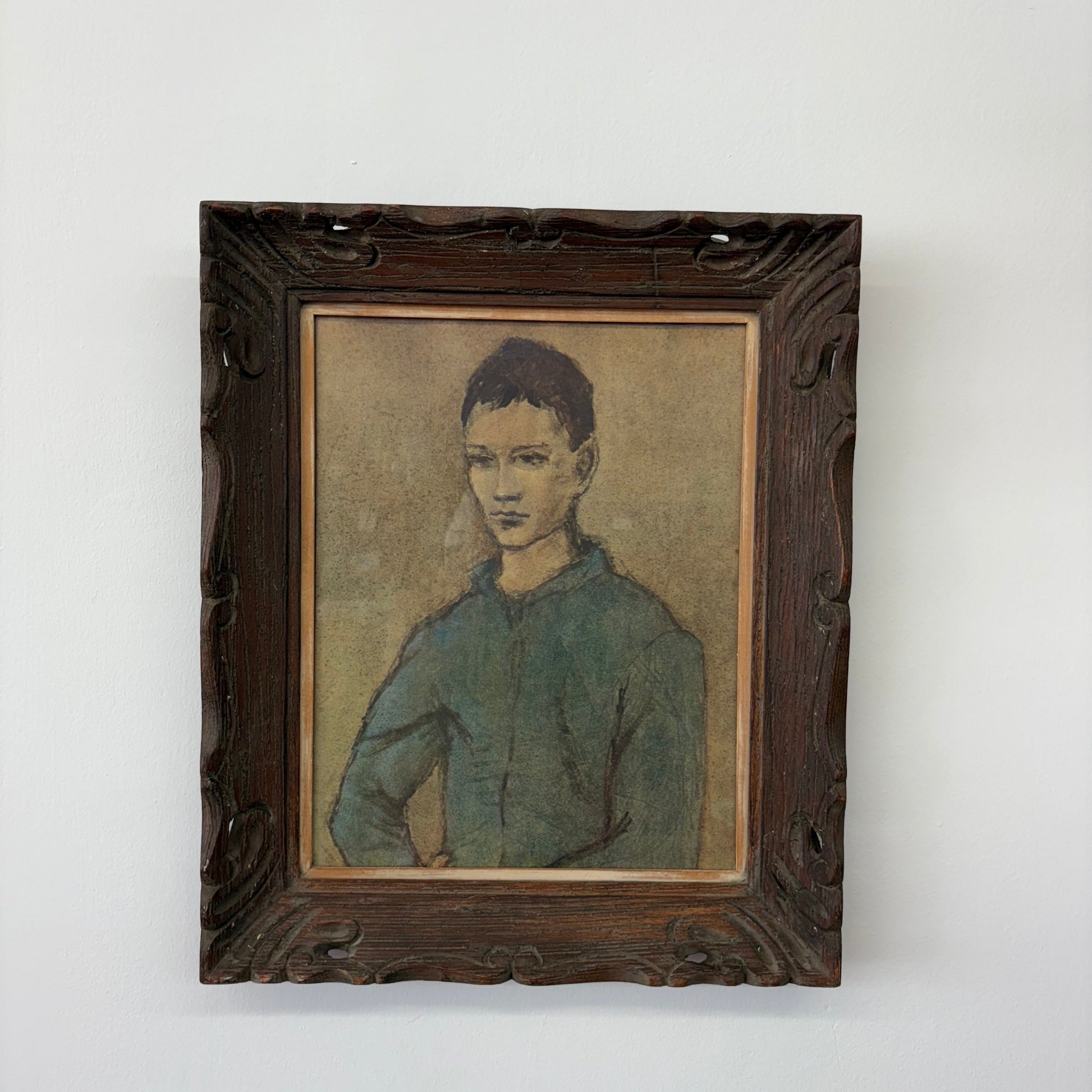 A soulful Blue-Period portrait inspired by Pablo Picasso’s 1901 study of a young man in muted teal and olive tones. Executed on textured board and framed in a deeply carved oak frame, the piece captures the quiet introspection and limited palette that define Picasso’s early Paris years. A subtle signature lower right indicates it is a mid-century reproduction created in homage to the master.