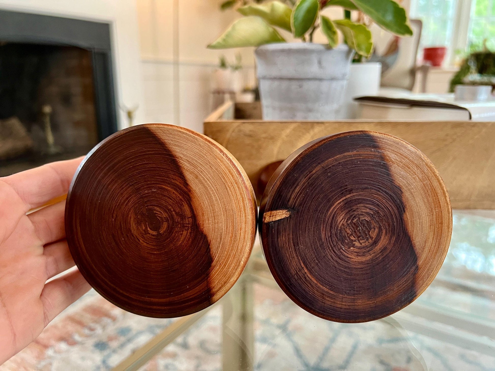 These candle sticks are made from a solid piece of wood. They will look great on your table, mantle or shelf. Mix them with your silver candle sticks and a couple of vases for a very elegant, mid century modern dream. They will also make a great, unique gift.