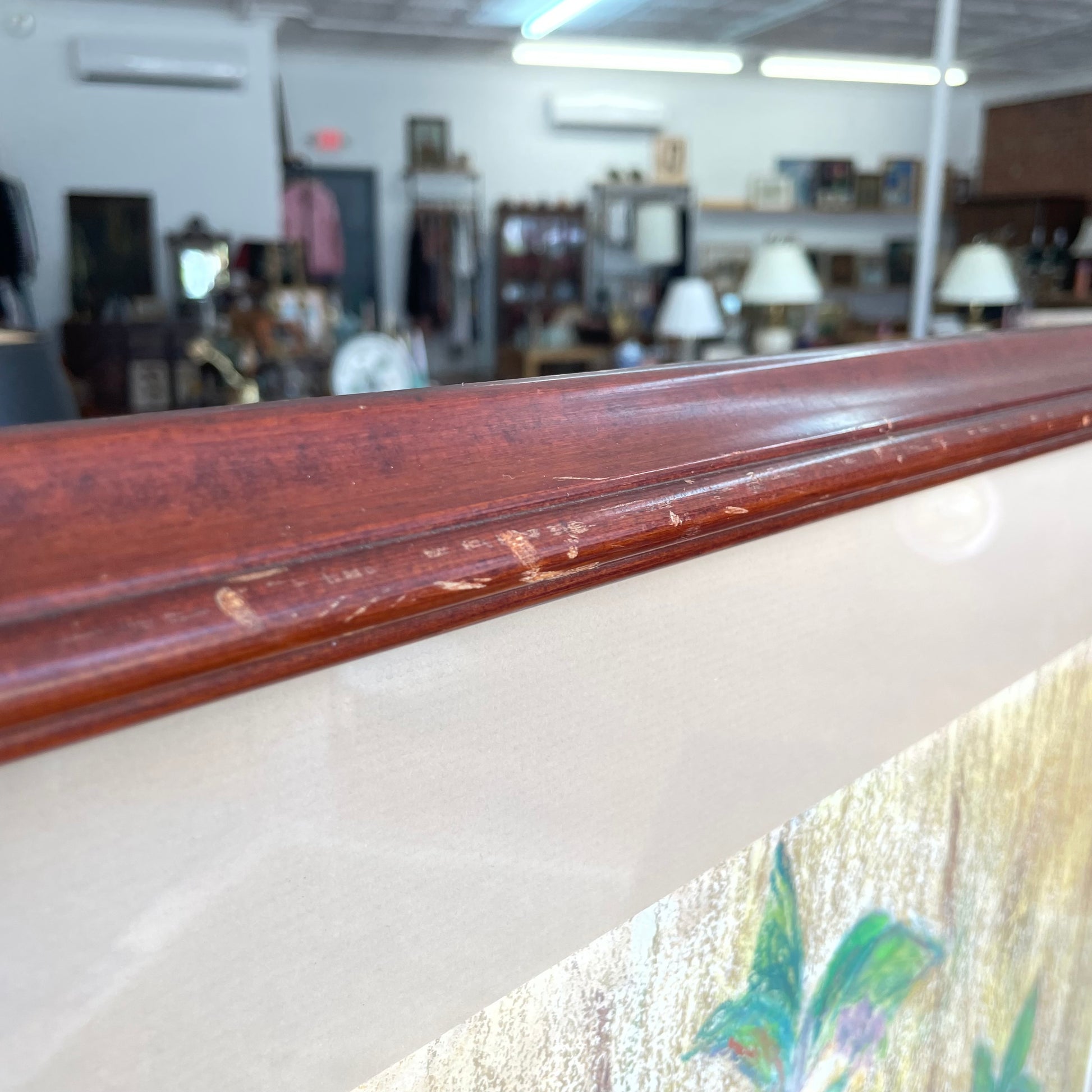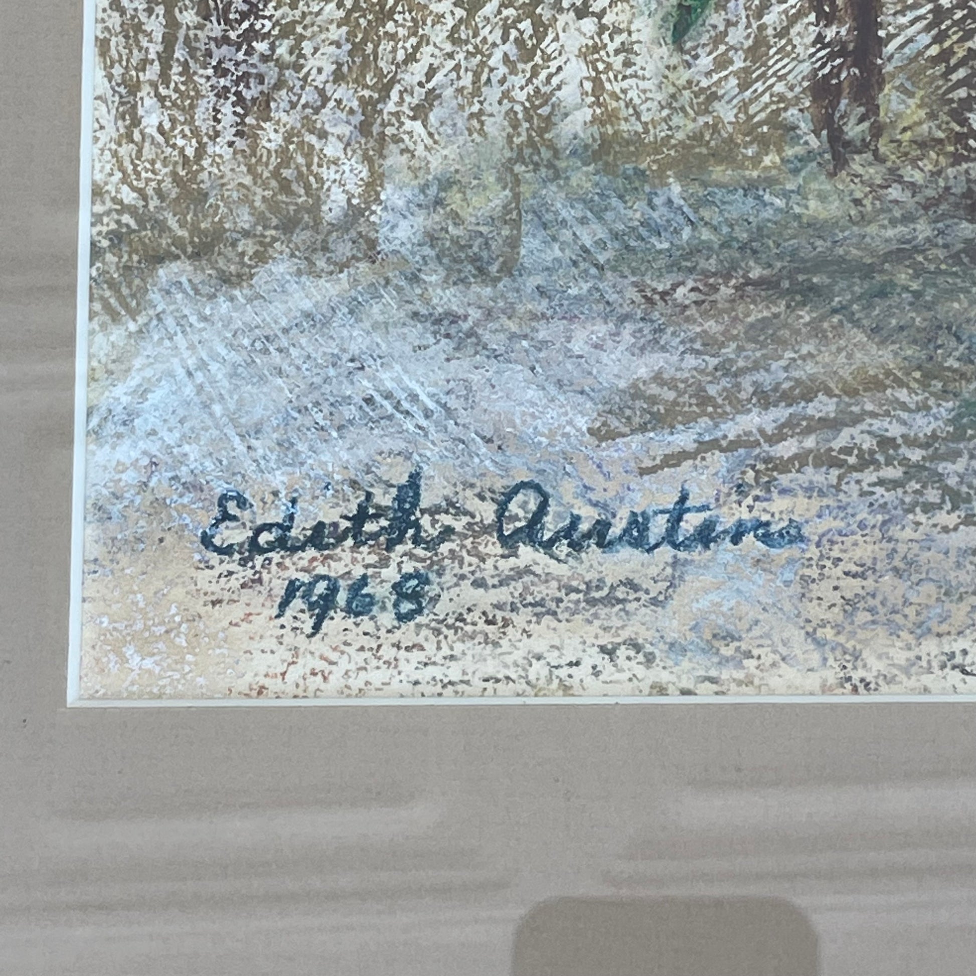A soft yet striking original pastel drawing by Edith Austin, dated 1968. This still life features a lush green plant with purple buds in a deep blue vase, set against a warm, textured background. Beautifully matted and framed in wood with glass, it's a timeless and serene piece for any vintage art lover or collector.