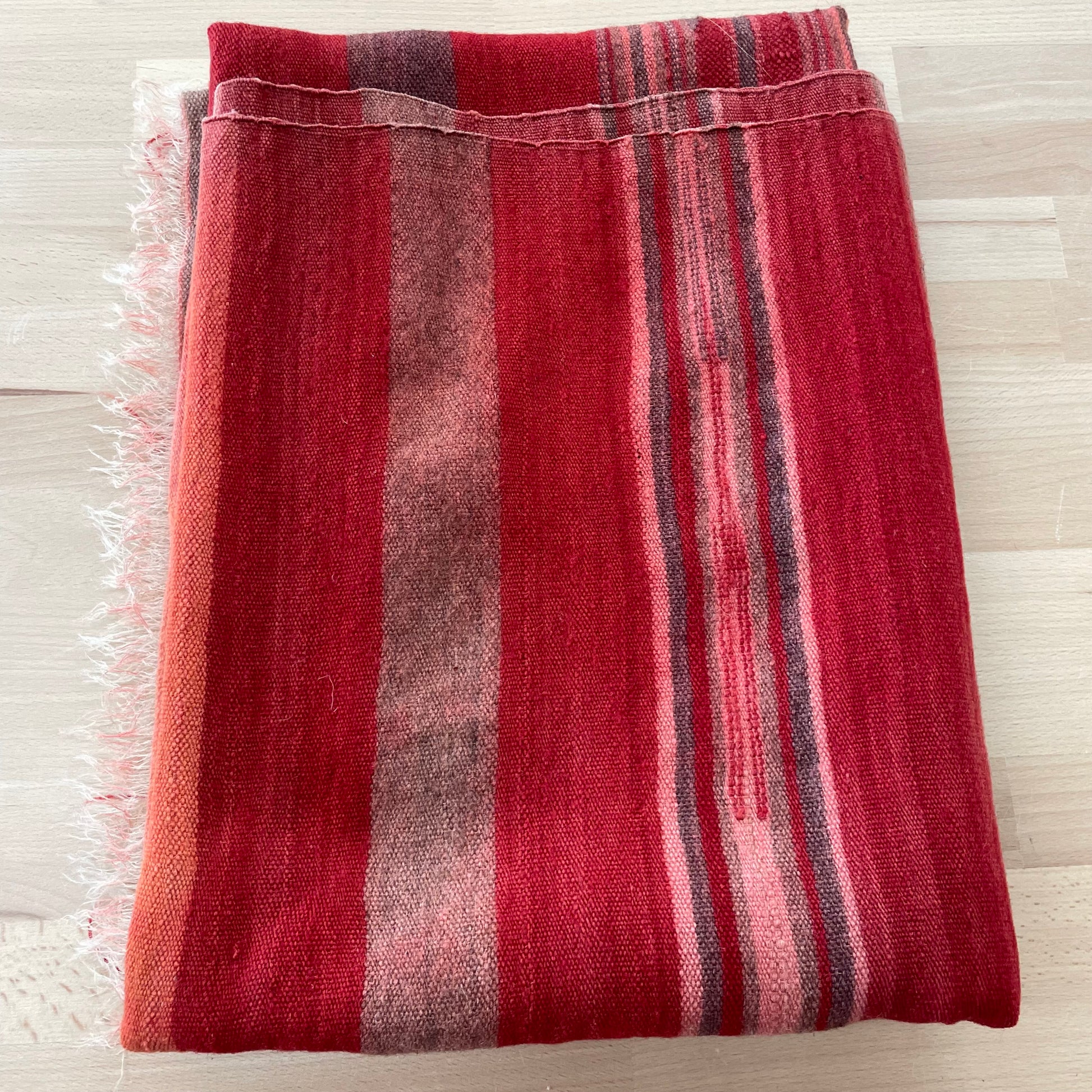 Warm up your space with this vintage wool blanket featuring rich red, rust, and rose-toned stripes in a handwoven design. Fringed edges and soft wool texture make this versatile piece perfect as a boho throw, rustic wall tapestry, or cozy bed or sofa layer. Its bold color palette and traditional woven craftsmanship bring instant warmth and texture to any room.