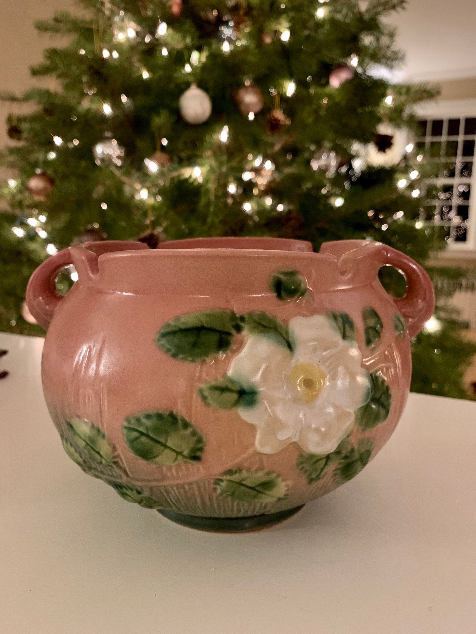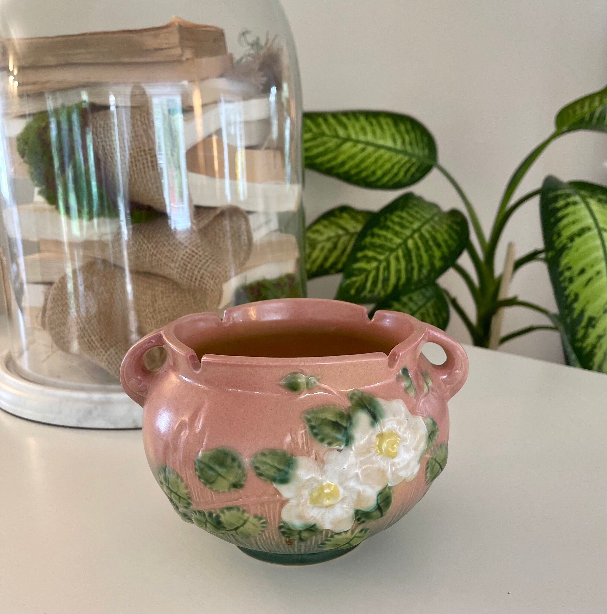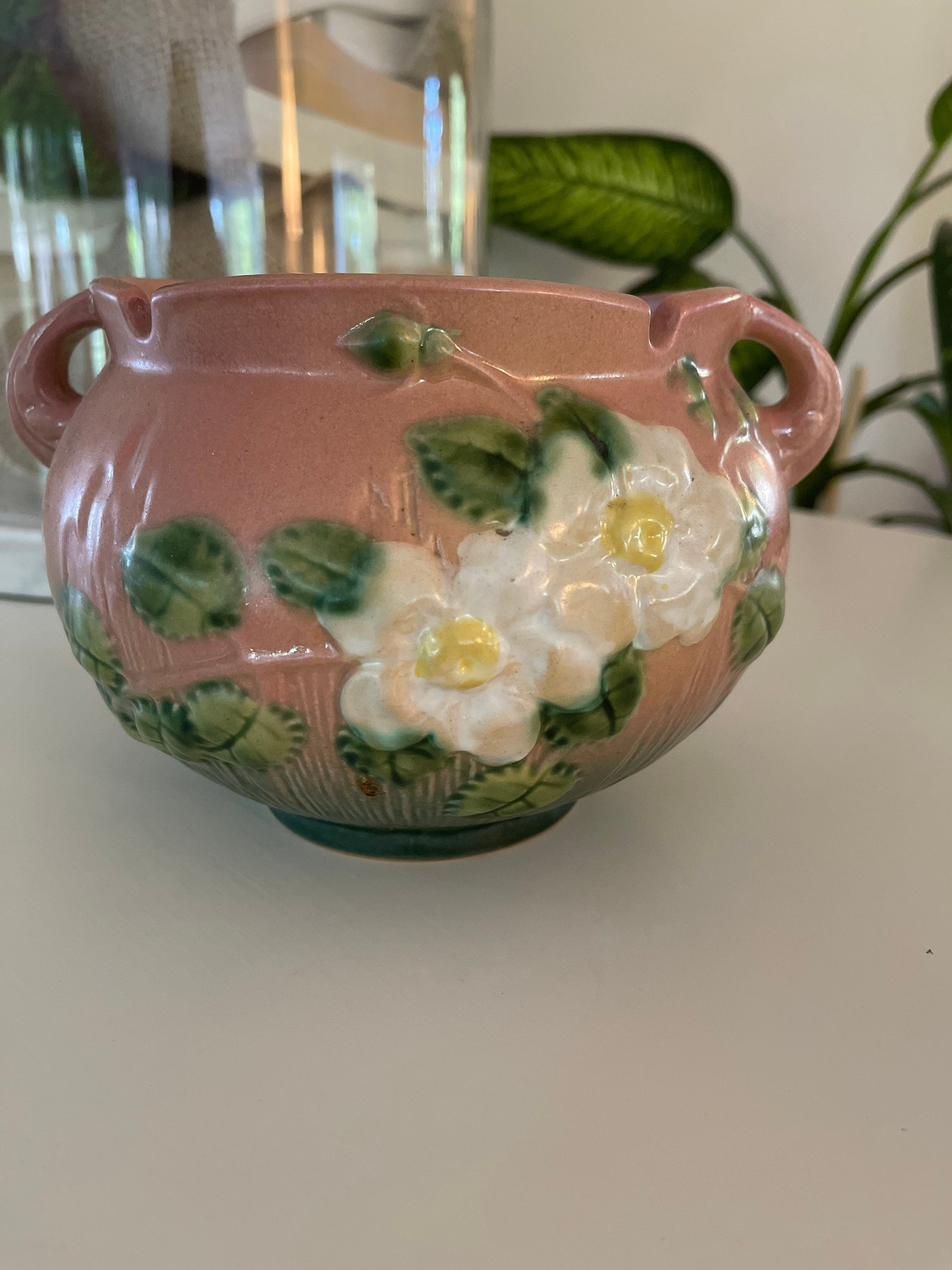 A rare find! This is a Roseville Pottery White Rose Jardiniere Vase Planter from the 40s. This is a beautiful piece of American pottery. The front features the double white roses and the back side features the single white rose. A great piece of history.