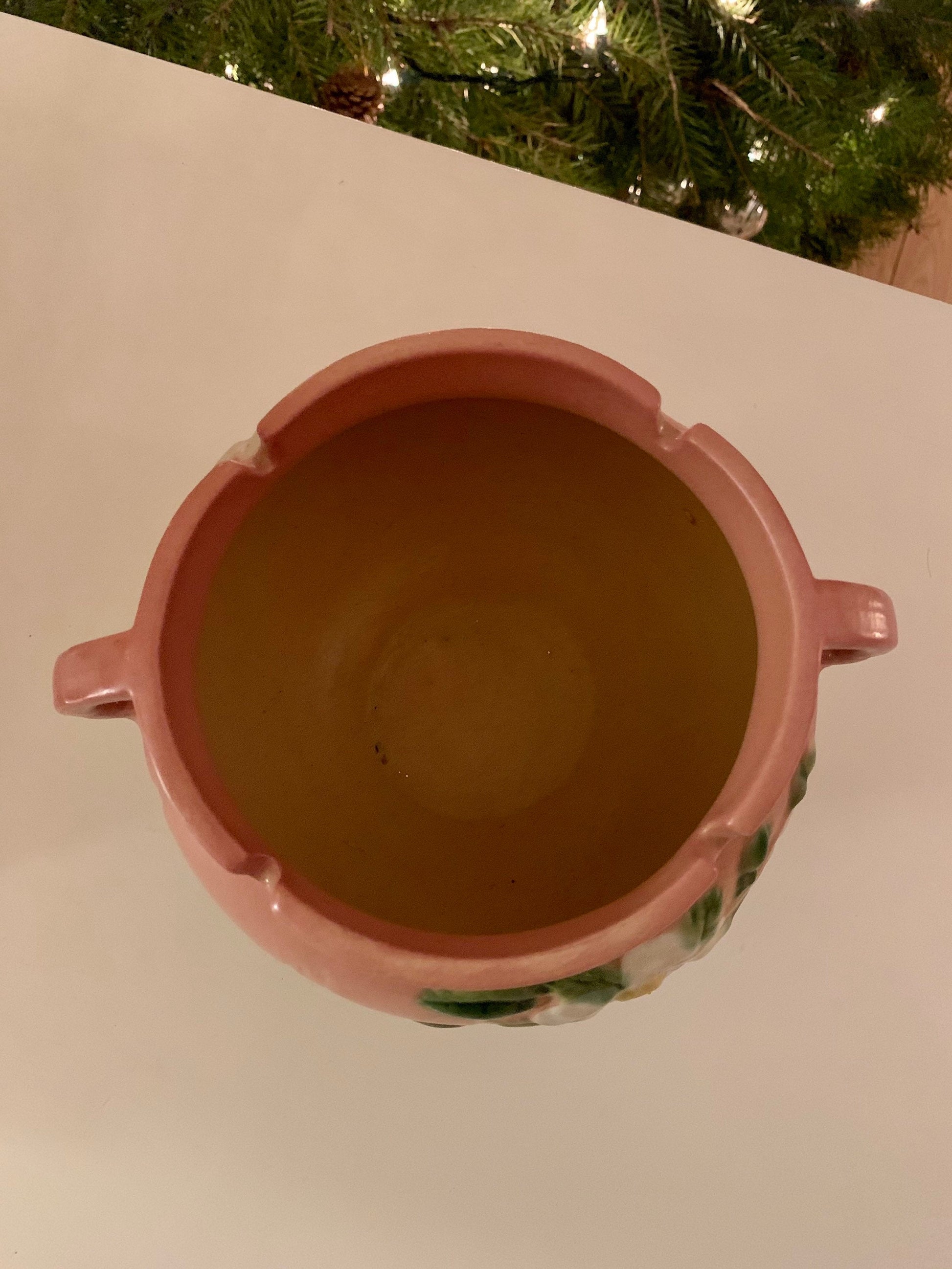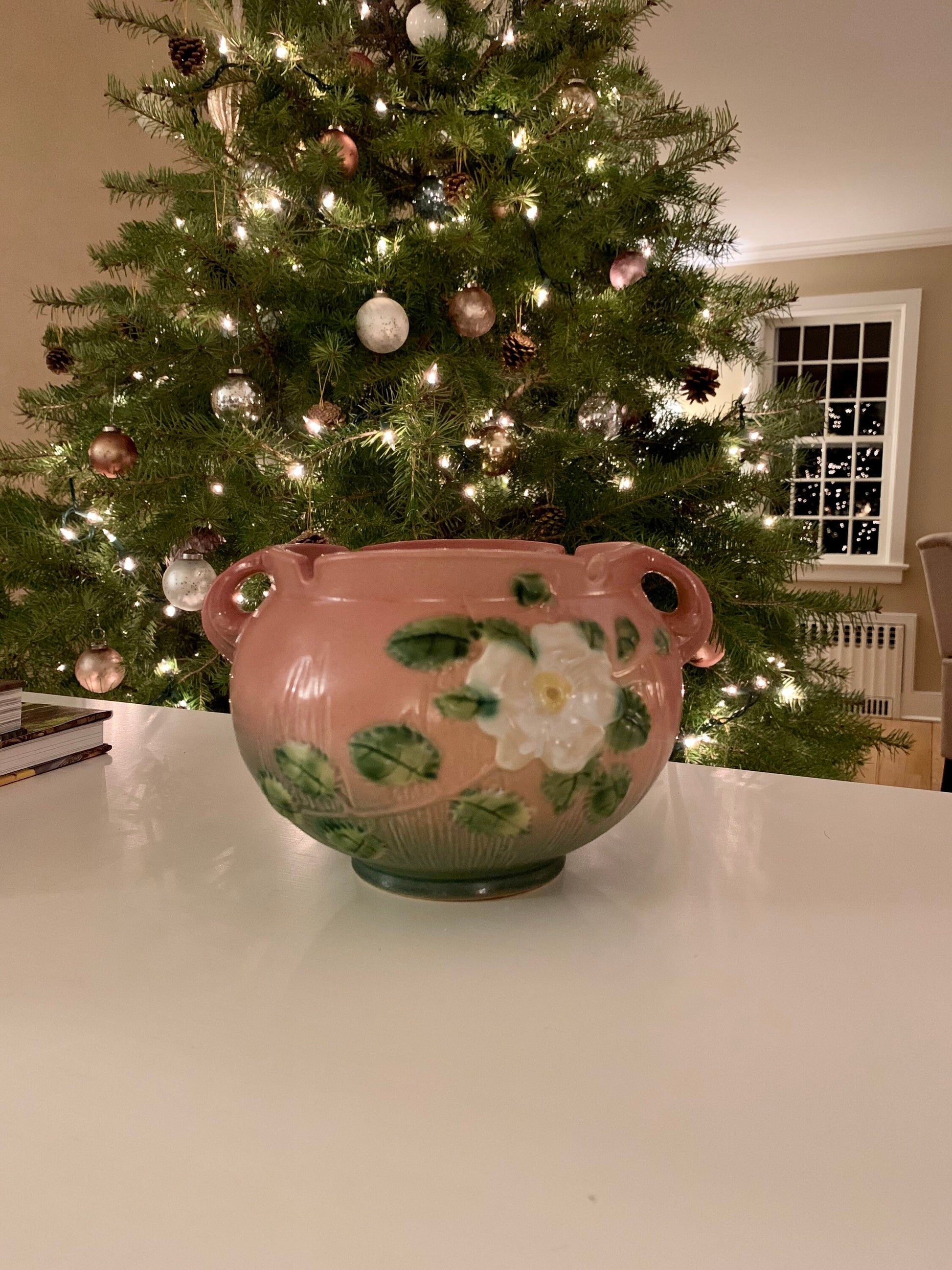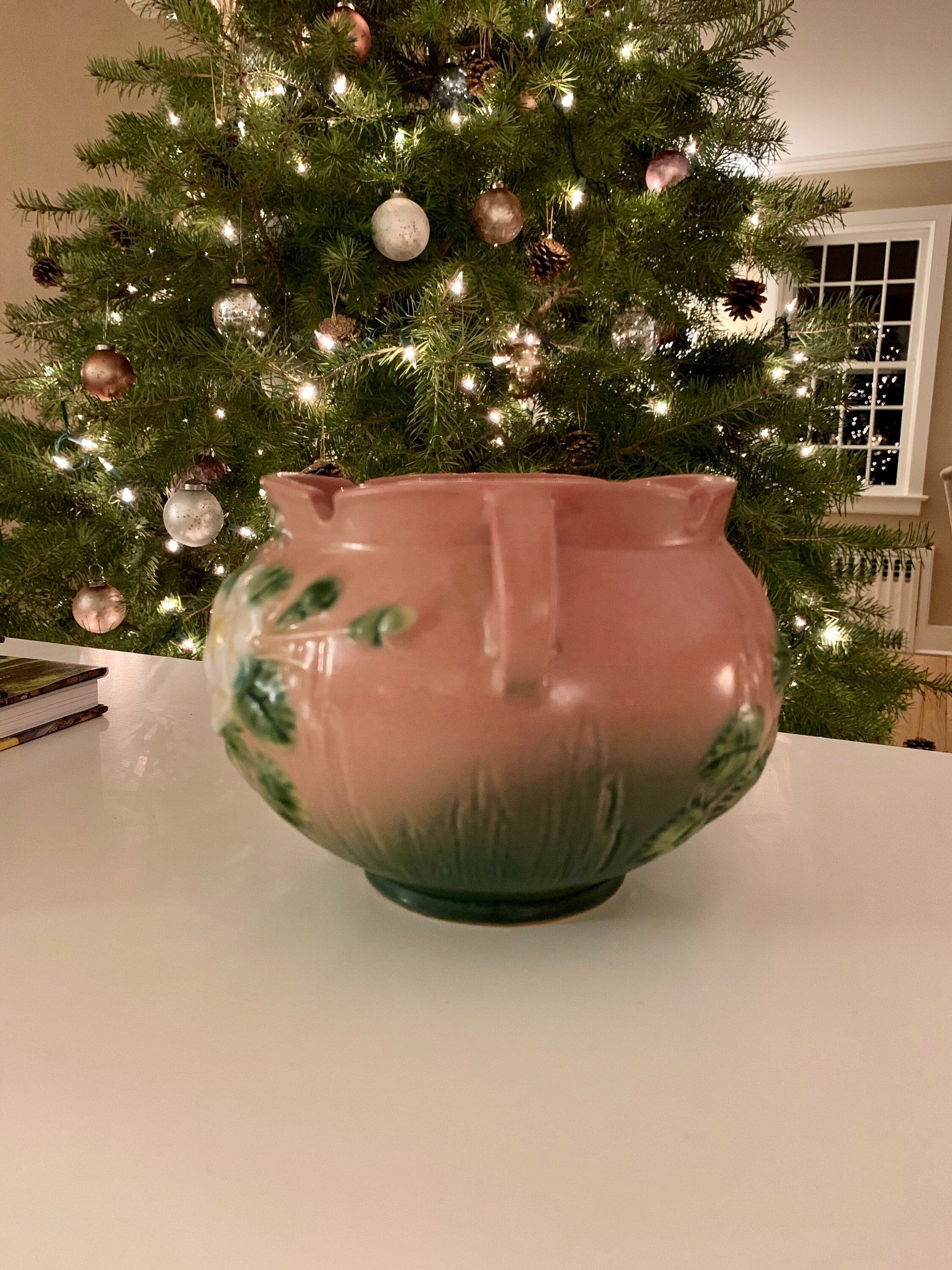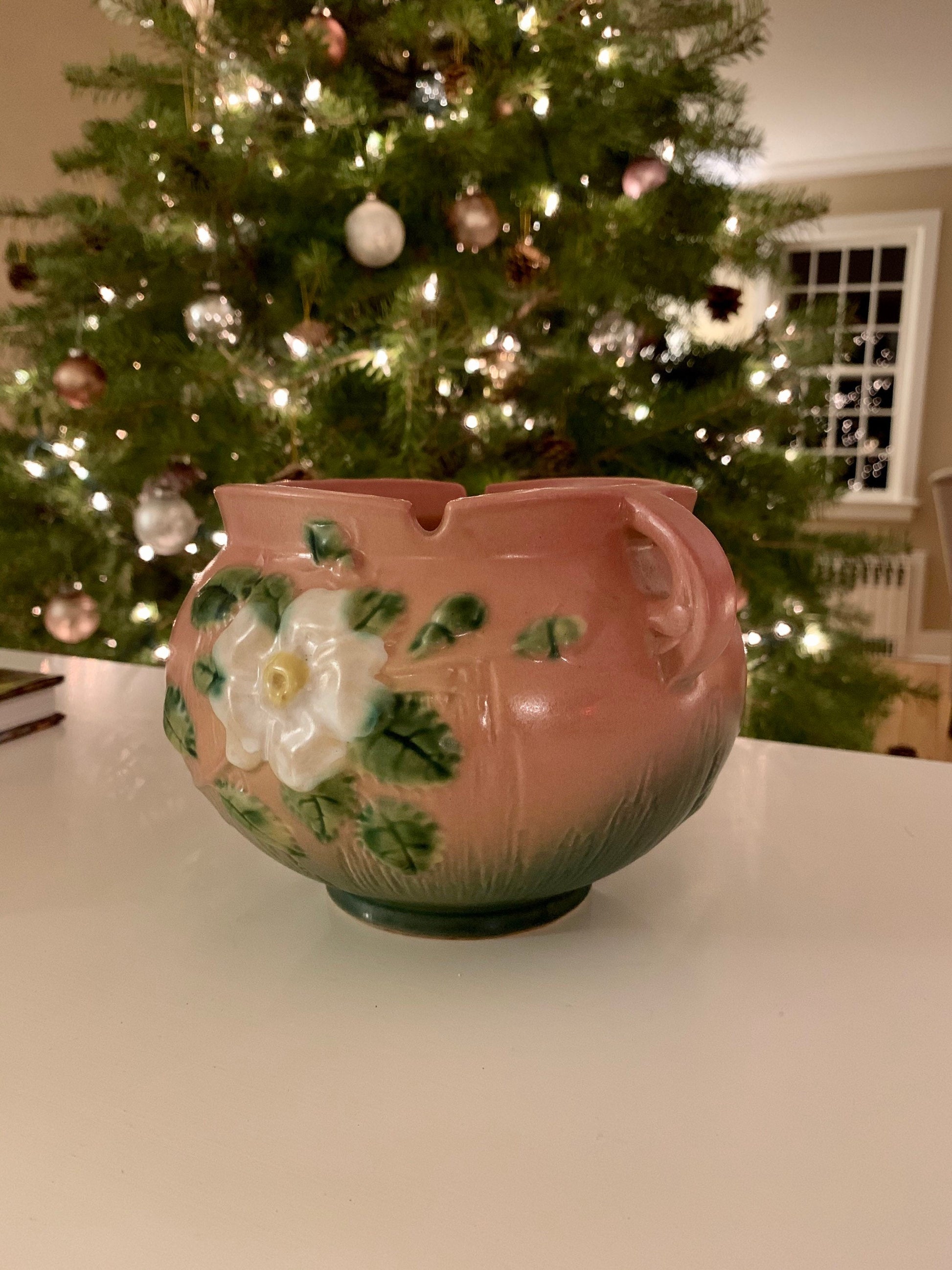 A rare find! This is a Roseville Pottery White Rose Jardiniere Vase Planter from the 40s. This is a beautiful piece of American pottery. The front features the double white roses and the back side features the single white rose. A great piece of history.