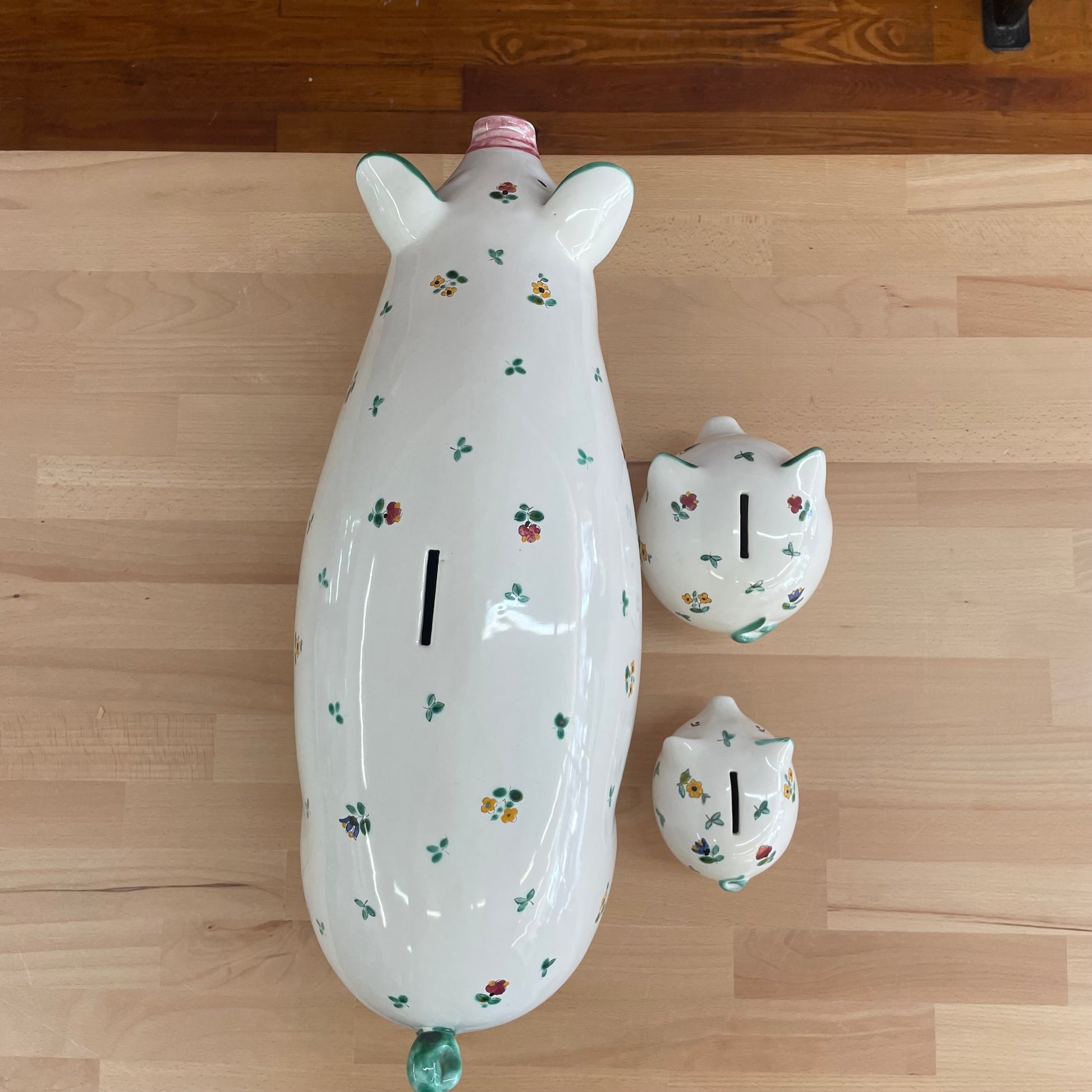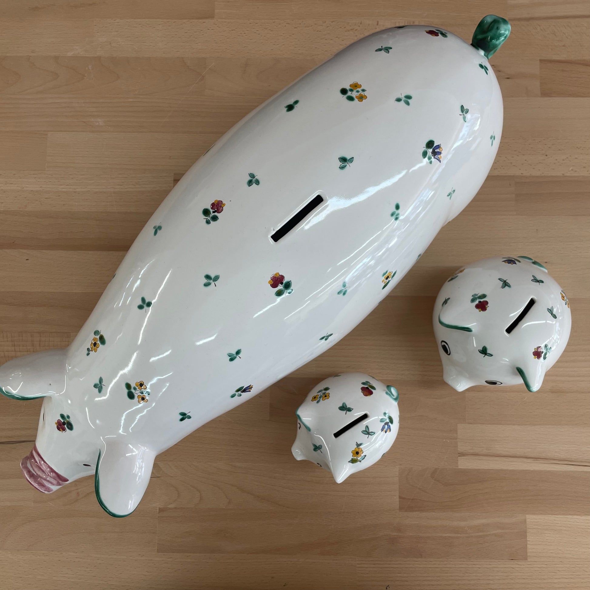 The set includes one large, one medium, and one small piggy bank, each with its own delightful proportions and character. Handmade in Austria, these banks function beautifully as both savings vessels and playful decorative objects—perfect for shelves, nurseries, or kitchen nooks.