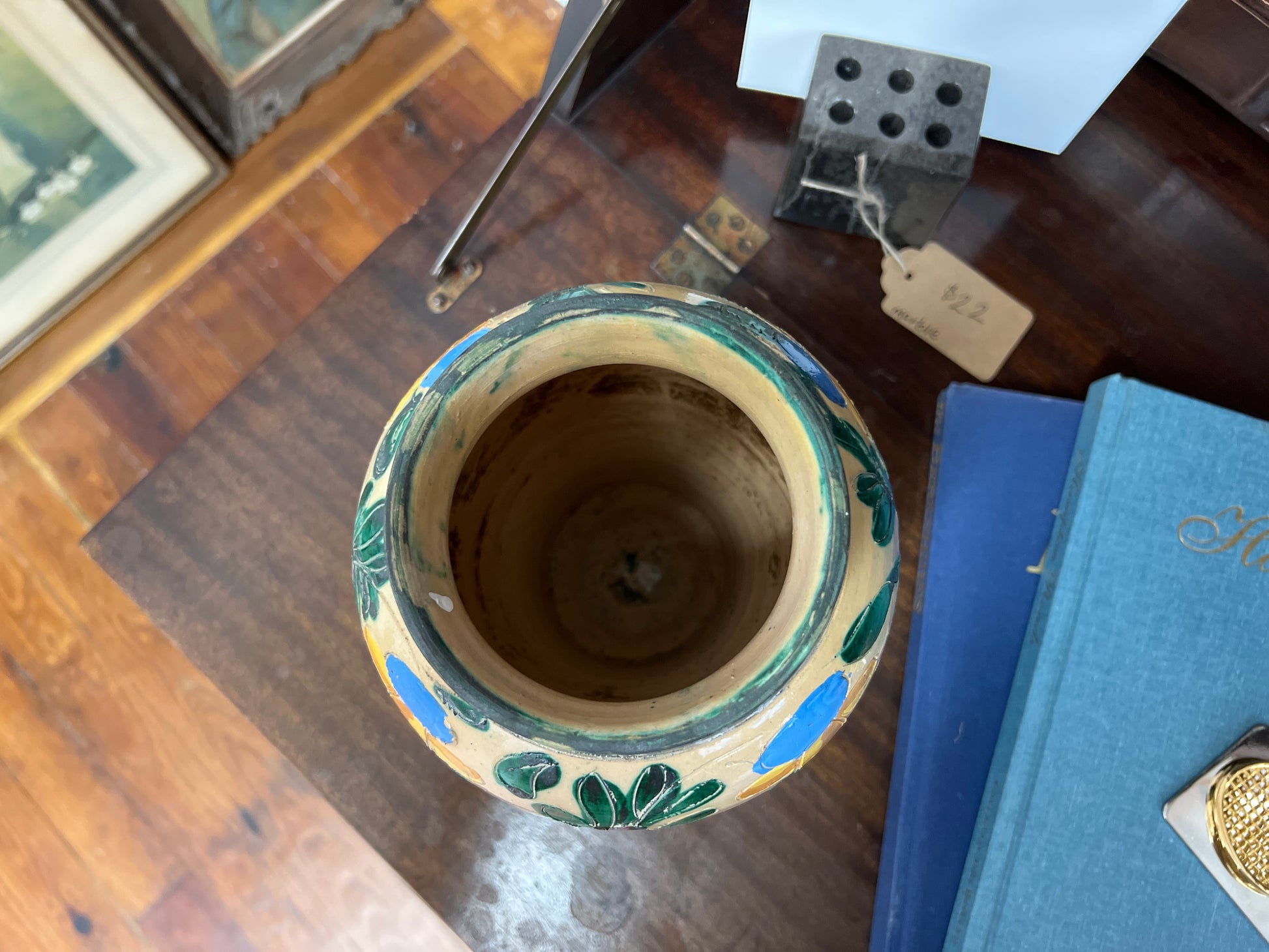 Fired twice to fuse pigment and glaze, the surface boasts the luminous gloss and saturated tones collectors love. The soft baluster form and raised foot make it equally at home holding a few stems or standing alone as a sculptural accent.