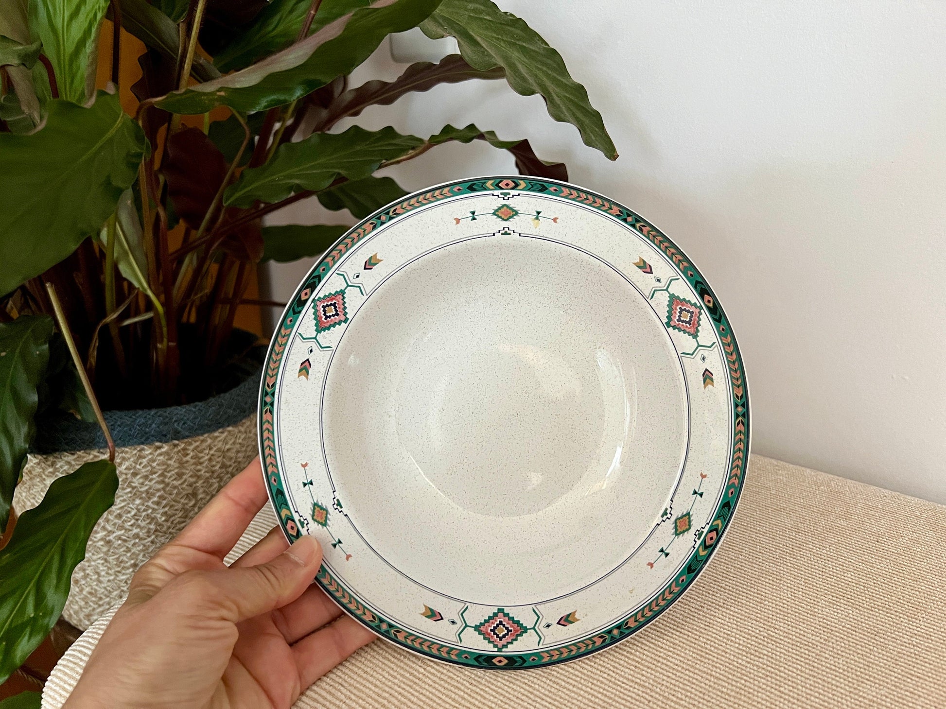 This is a Studio Nova Adirondack Southwest Aztec design soup bowl. These were exclusively designed for Mikasa. Bowl is white with a beautiful Aztec design (Y2201) in turquoise and pink!