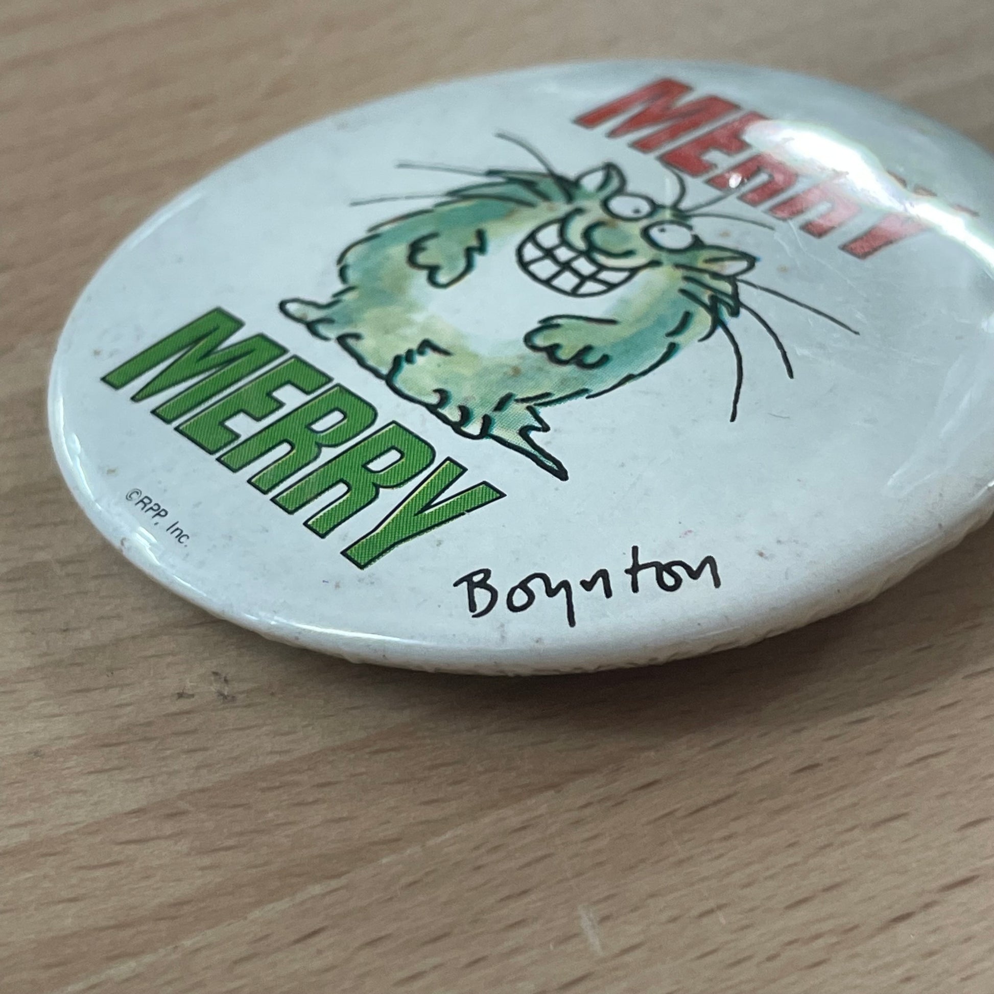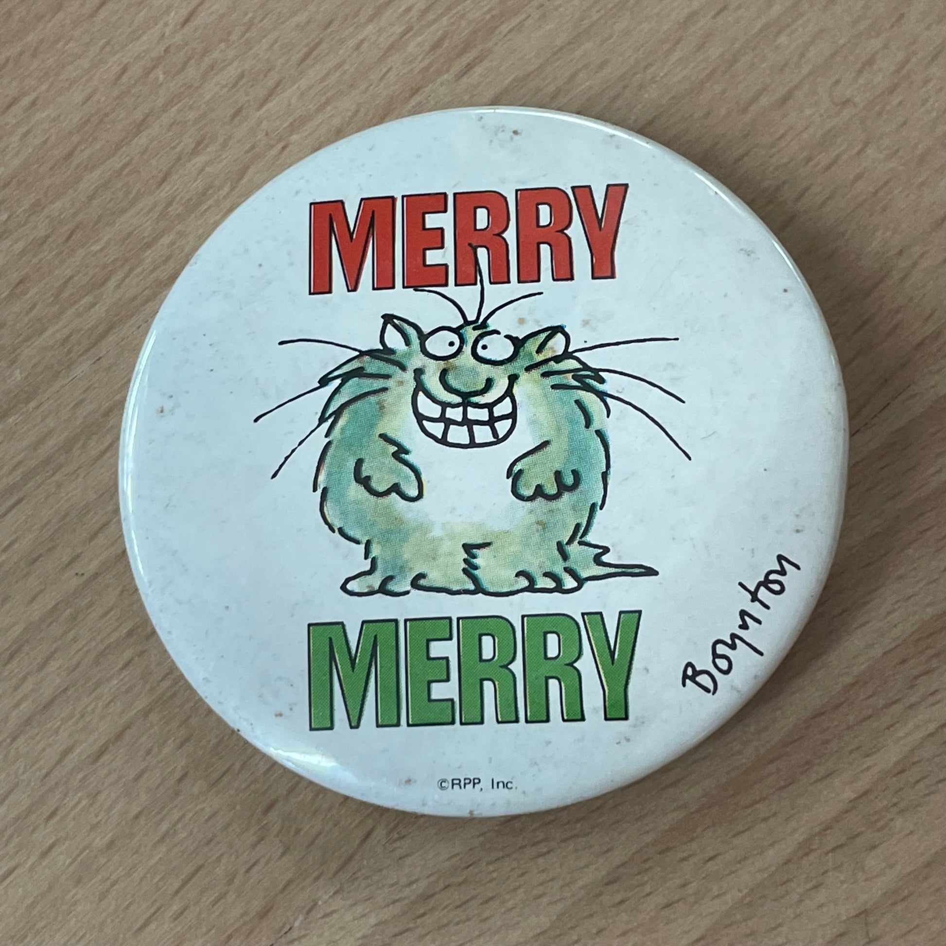 Celebrate the season with this cheerful vintage Sandra Boynton pin, featuring her signature quirky cat illustration and bold “Merry Merry” text in festive red and green. Printed by RPP, Inc., this collectible button captures Boynton’s whimsical humor and charming art style. Perfect for holiday wear, gifting to a Boynton fan, or adding to a vintage pin collection.