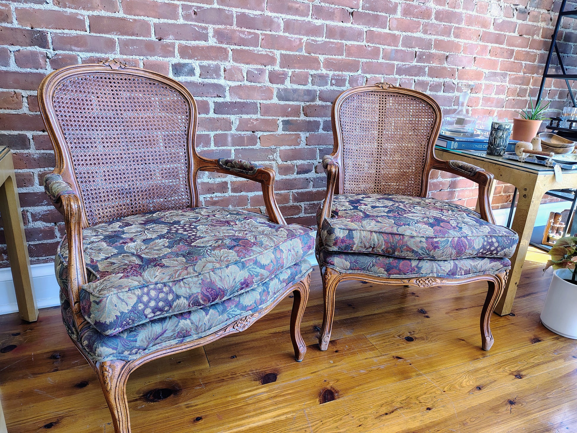 This elegant pair of vintage French Louis XV-style fauteuil armchairs feature hand-carved wood frames, curved cabriole legs, and floral motifs that showcase timeless craftsmanship. The caned backs and upholstered seats are in excellent condition, upholstered in richly woven tapestry fabric with a grapevine and leaf pattern in shades of green, plum, and gold.