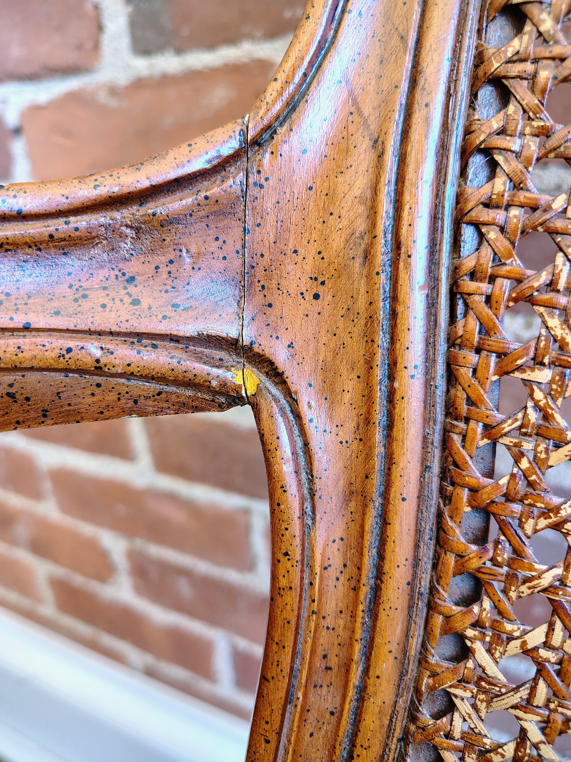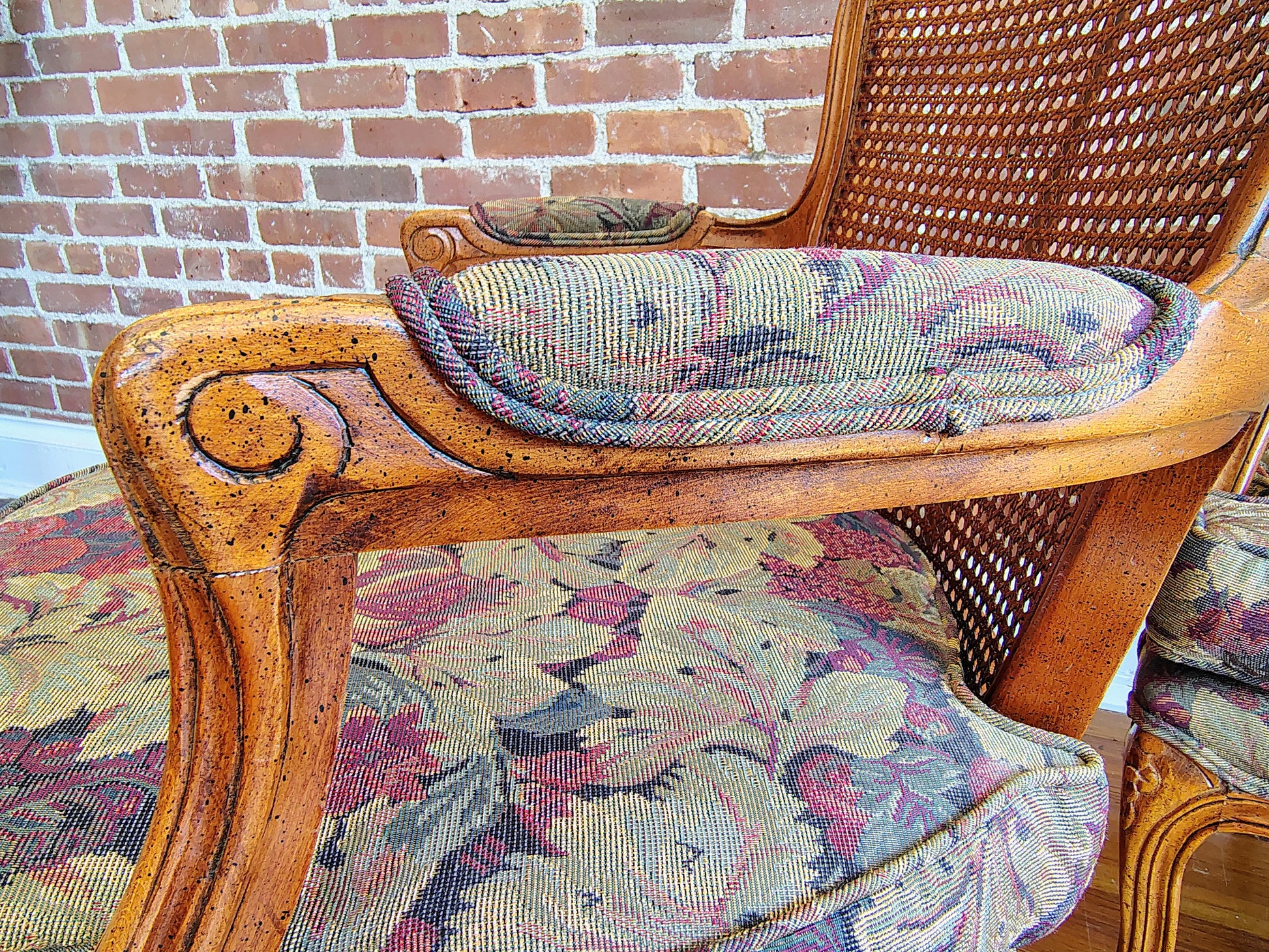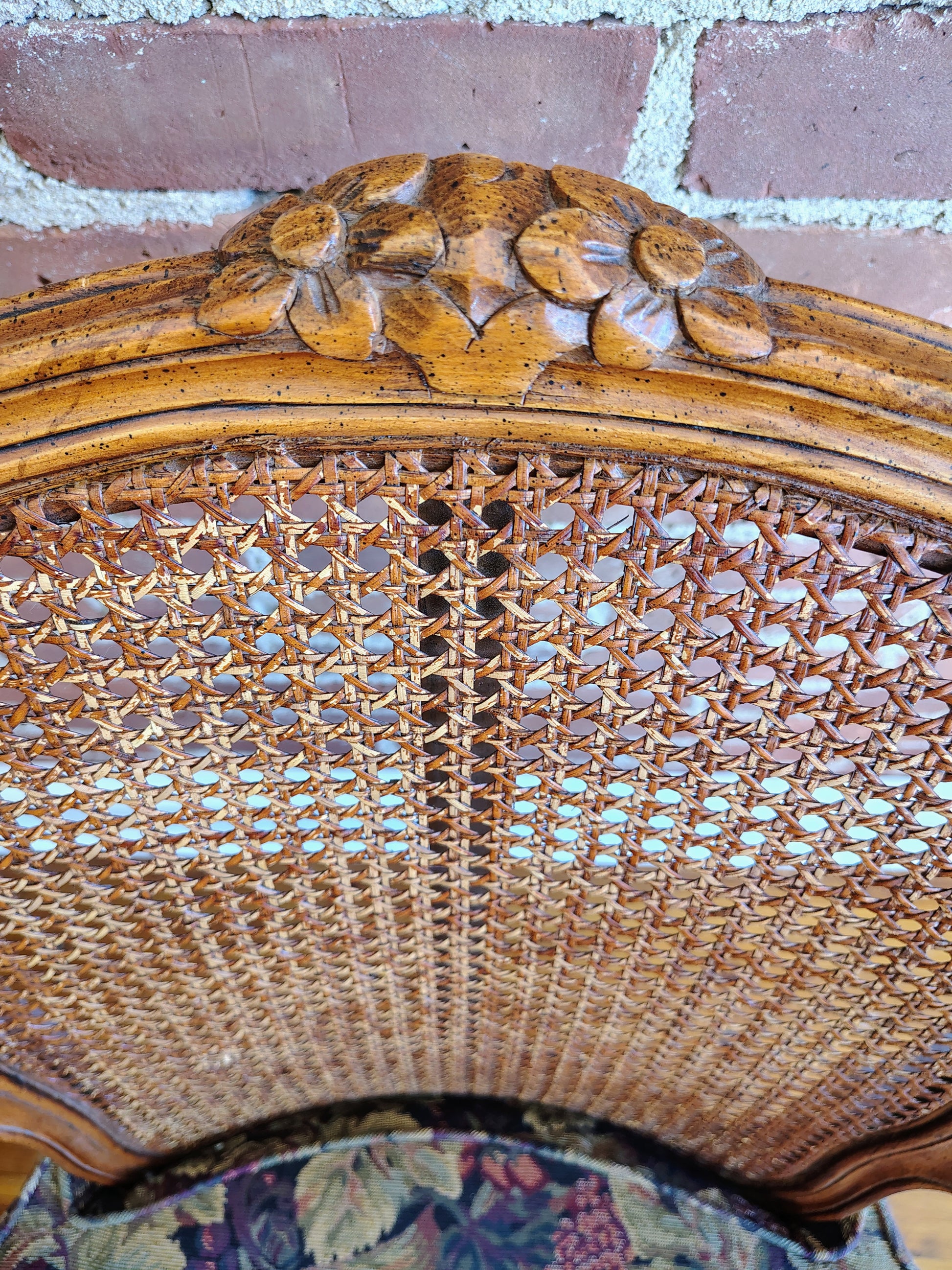 Perfect as statement seating in a living room, bedroom, or reading nook. The mix of caned texture, carved detail, and floral fabric lends charm to both traditional and eclectic interiors.