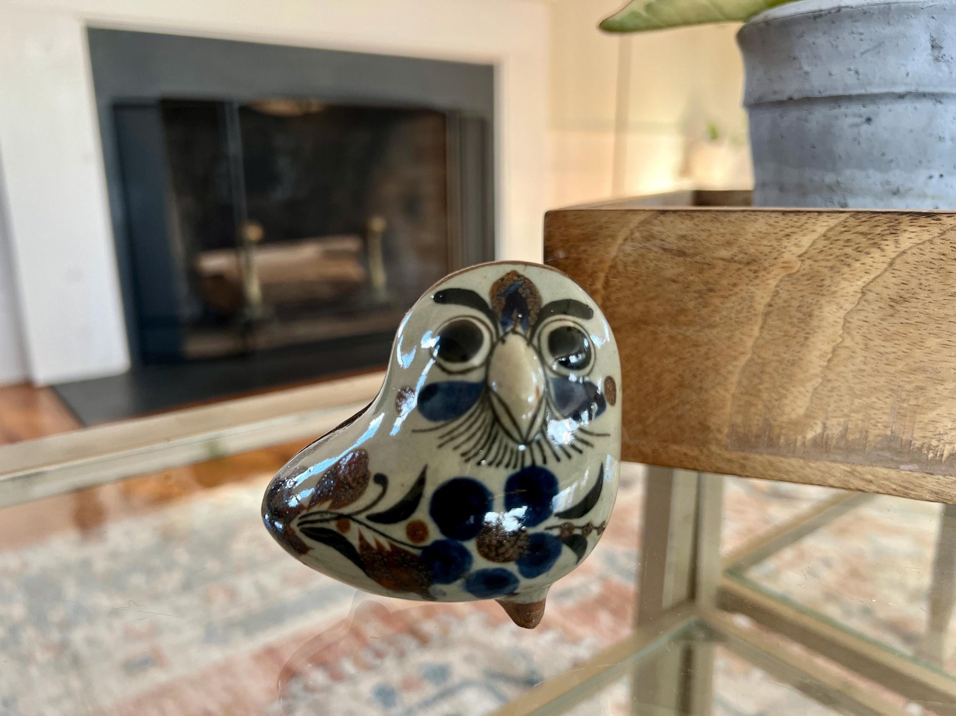 Amazing piece of Tonala Mexican Pottery found at a Westport CT estate sale. A beautiful hand-painted piece of Tonala Mexican folk art in the shape of a bird, dove. It will look stunning displayed on your shelf or make a fantastic gift. Great to style with larger Tonala pieces for a cohesive look.