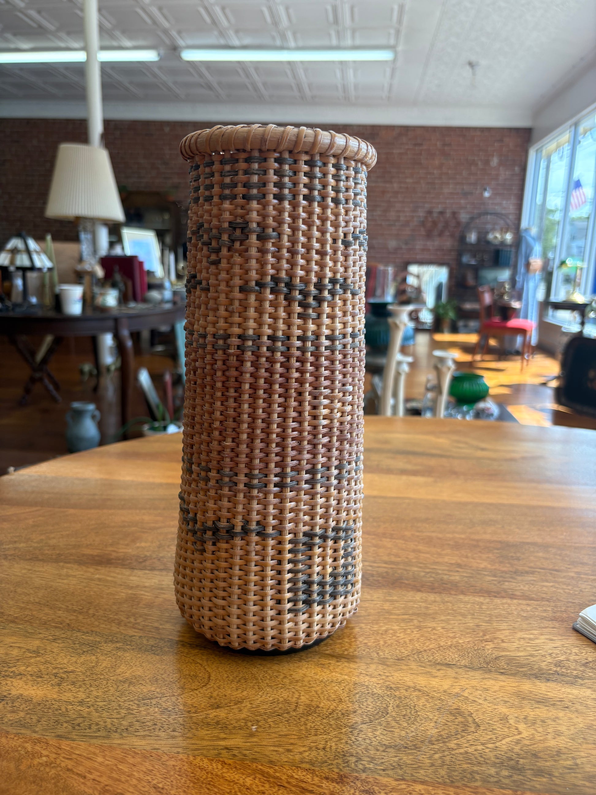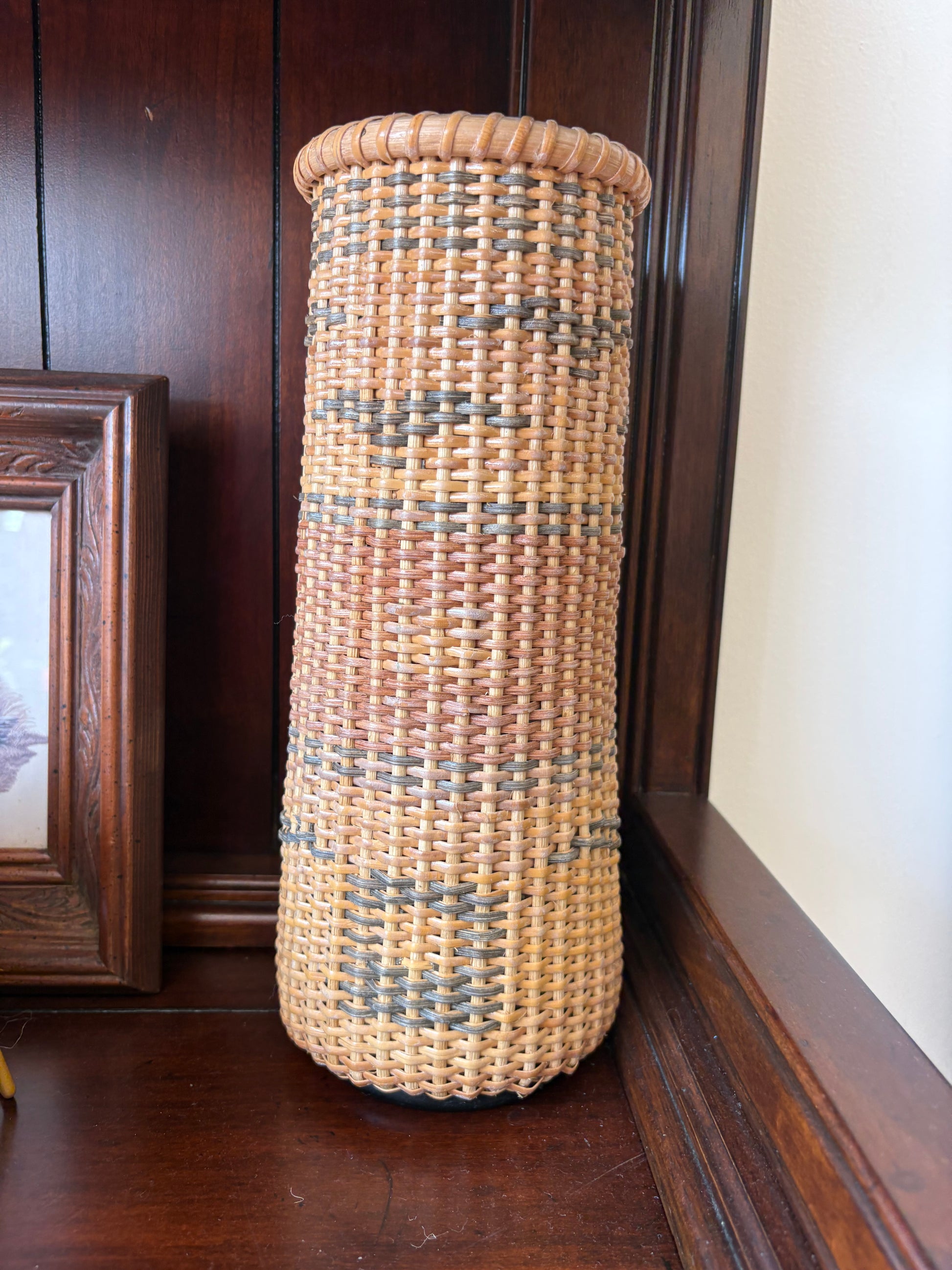 Add warmth and texture to your space with this beautifully handwoven tall wicker vase. Crafted in a Nantucket-style weave, this cylindrical vessel features soft, earthy tones in a subtle check pattern. Lightweight yet sturdy, it makes a lovely display for dried or faux florals, or as a standalone decorative accent in a cozy cottage, coastal, or boho-style room.